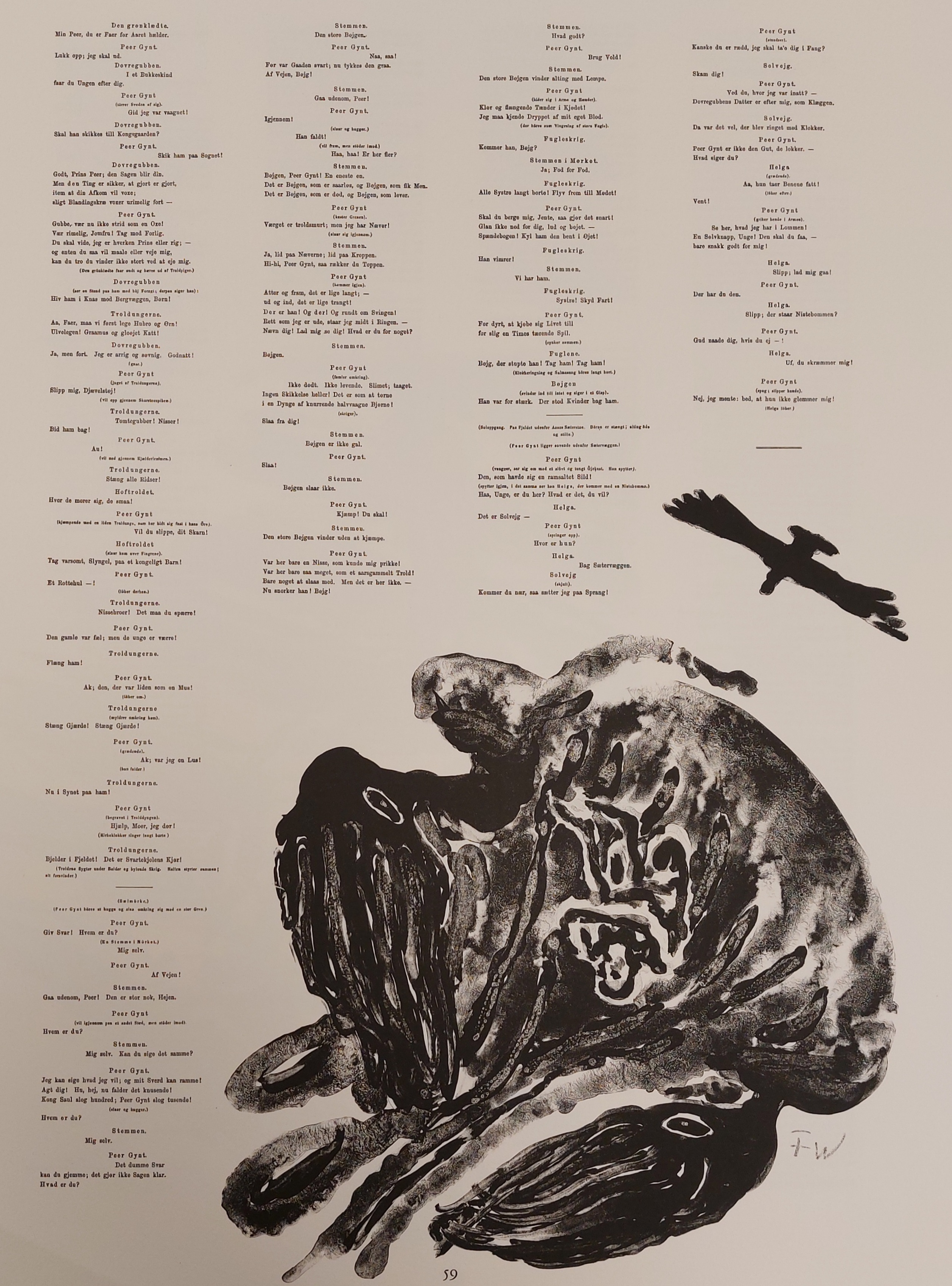 Sort/hvitt-litografi fra Peer Gynt. Motivet er ikke originalsignert, men signert i litostenen.