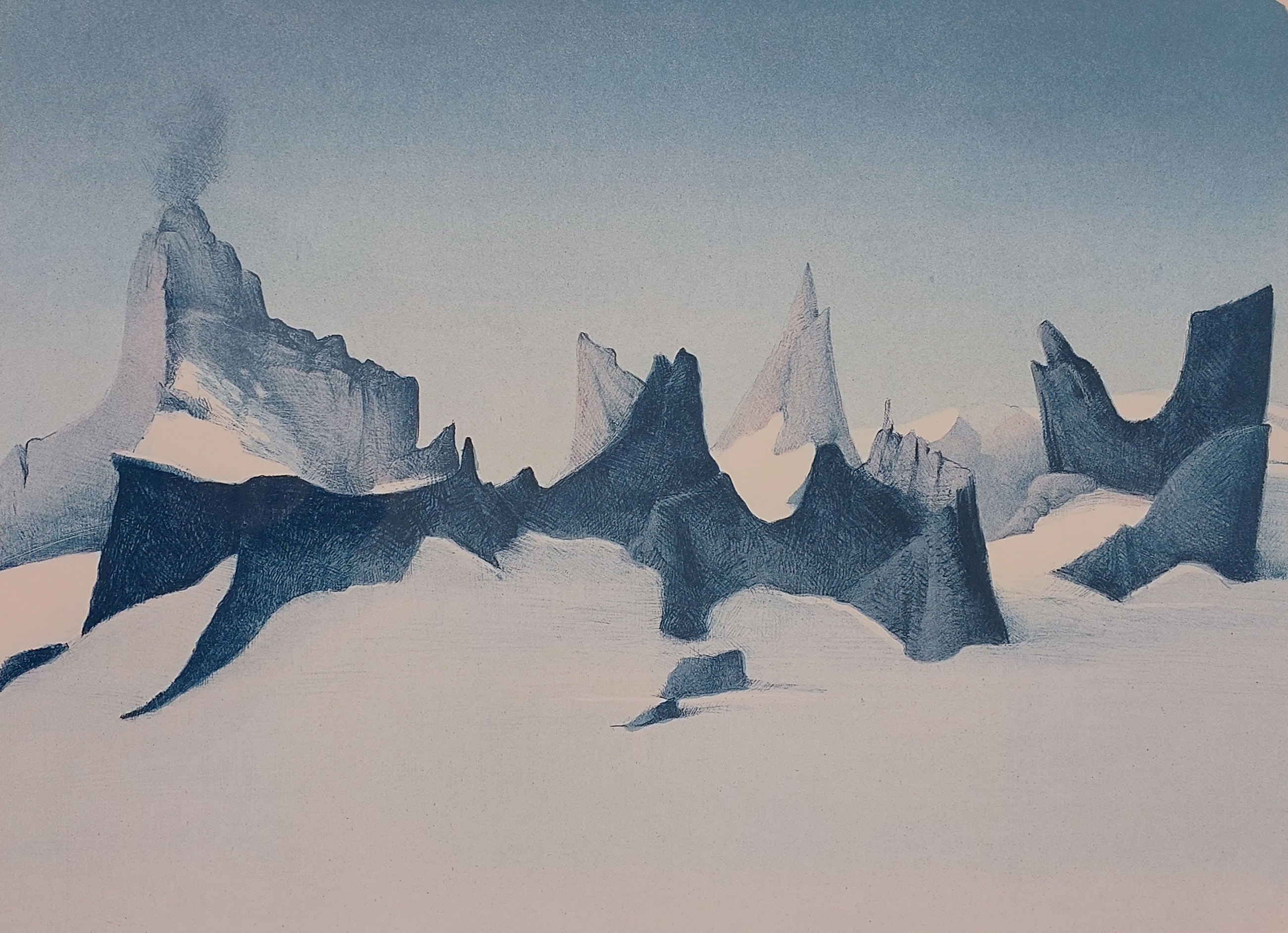 Innramming med vanlig glass, 3-dobbelt passepartout, hvorav ett er gråblått, og profilert champagnefarget list er inkludert i prisen.