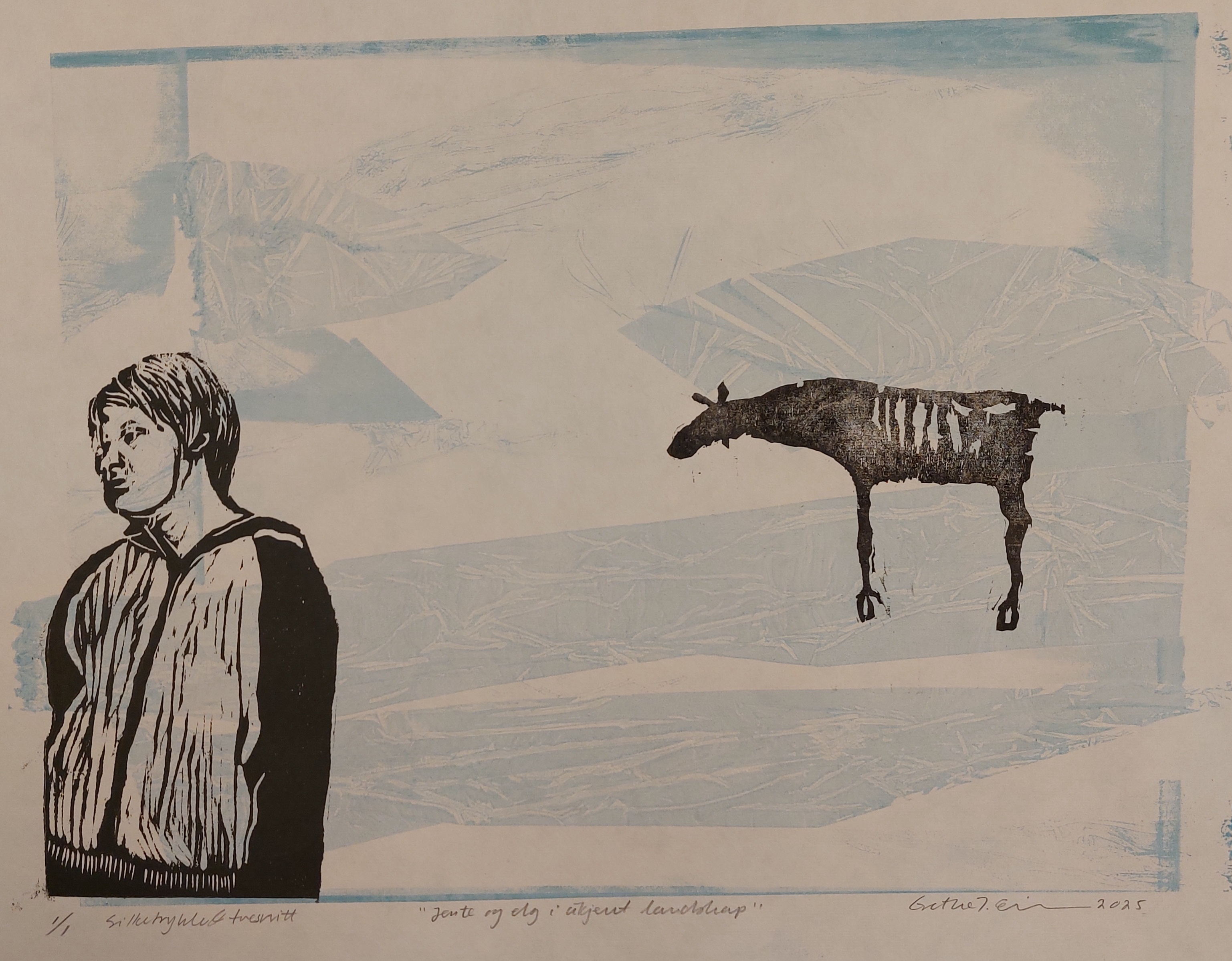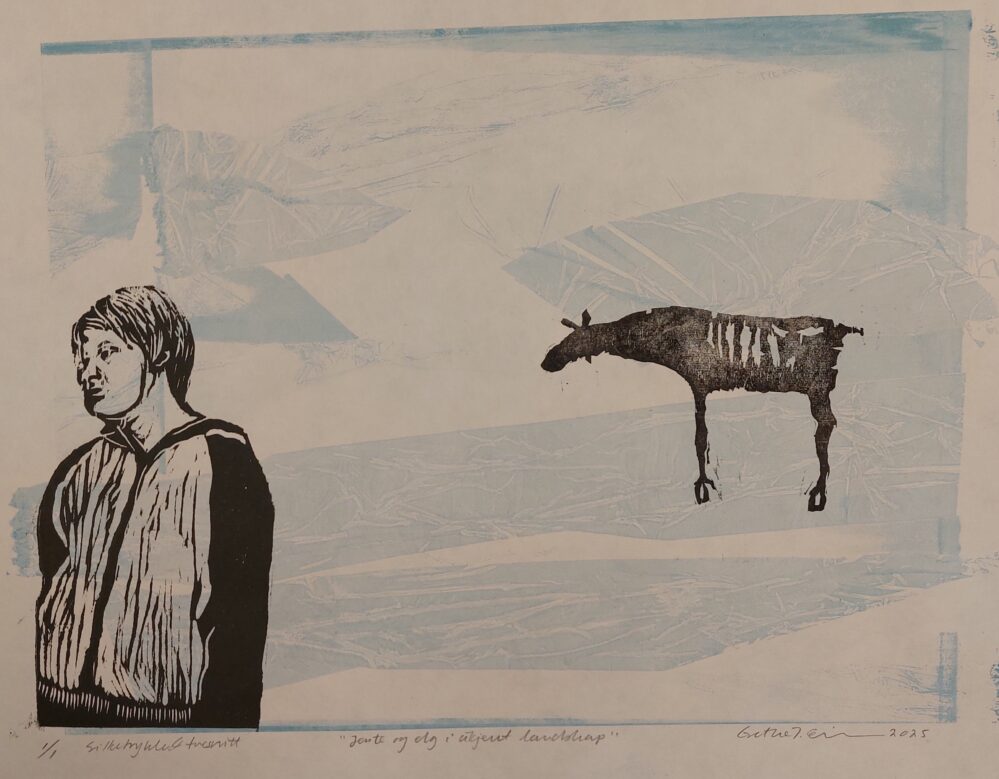 Jente og elg i ukjent landskap